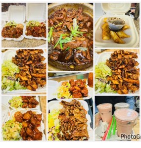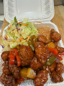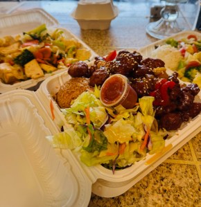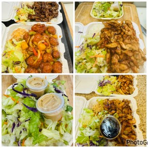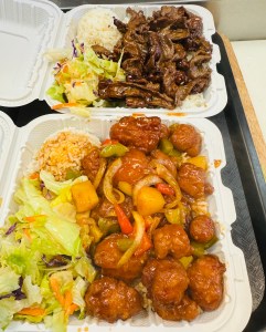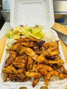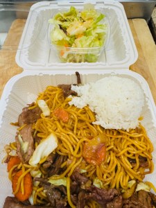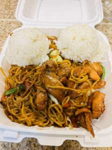 Chicken Yakisoba with our “Secret” sauce with White Rice and Stir Fried Veggies.